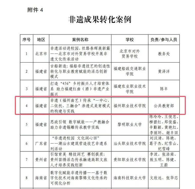 近日,中國職業(yè)技術(shù)教育學會發(fā)布《關(guān)于公布職業(yè)教育“立德樹人”、解決產(chǎn)業(yè)發(fā)展問題、“職教出海”、非遺成果轉(zhuǎn)化案例名單的通知》,我校報送的《非遺(福州曲藝)傳承“一中心、二依托、三融合”滲透式美育模式的構(gòu)建與實踐》成功入選“非遺成果轉(zhuǎn)化”典型案例。