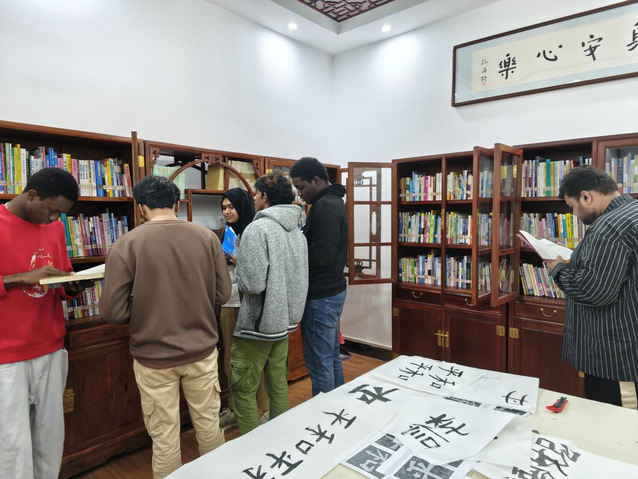 活動(dòng)伊始,薩曉靜老師以“和平”二字為切入點(diǎn),帶領(lǐng)國(guó)際學(xué)生體驗(yàn)書(shū)法藝術(shù),解析漢字的空間美學(xué)與哲學(xué)內(nèi)涵,展現(xiàn)中華“和合”文化的當(dāng)代價(jià)值。留學(xué)生們?cè)诠P墨互動(dòng)中感受漢字魅力,現(xiàn)場(chǎng)反響熱烈。隨后,“來(lái)華學(xué)生閱讀專(zhuān)區(qū)”正式啟動(dòng),該專(zhuān)區(qū)精選700余冊(cè)多語(yǔ)種書(shū)籍,涵蓋漢語(yǔ)學(xué)習(xí)、當(dāng)代中國(guó)研究等主題,并設(shè)置“一帶一路”文獻(xiàn)專(zhuān)架。通過(guò)分級(jí)標(biāo)引和場(chǎng)景化陳列,降低信息獲取門(mén)檻,精準(zhǔn)服務(wù)國(guó)際學(xué)生需求。
