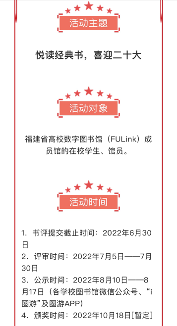 參賽方式:參賽師生手機(jī)訪問(wèn)福建省高校數(shù)字圖書館公眾號(hào)——FULink學(xué)科服務(wù)平臺(tái)完成個(gè)人賬號(hào)注冊(cè)。找到“福建省中科杯“喜迎二十大·青春逢盛世·奮斗正當(dāng)時(shí)”主題教育活動(dòng)”即可直接使用當(dāng)前賬戶信息參賽。
